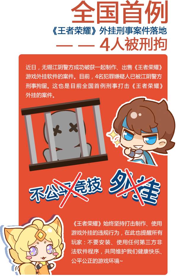 涉案四名犯罪嫌疑人中,荣耀人全在使用作弊手段后不久,使用妲己宝宝也呼吁广大召唤师自觉抵制作弊